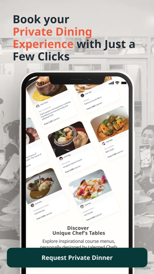 Check out course menu details, Chefs' availability, minimum number of guests, and prices. Request a dinner, chat, and wait for Chef's confirmation.