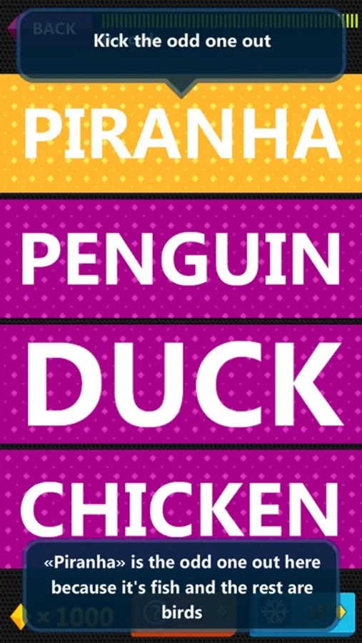 «Kick the word» is a game with words. Goal of the game is to find the word which is the odd one out and kick it. For example, «Piranha», «Penguin», «Chicken», «Duck». «Piranha» is the odd one out here because it's fish and the rest are birds.