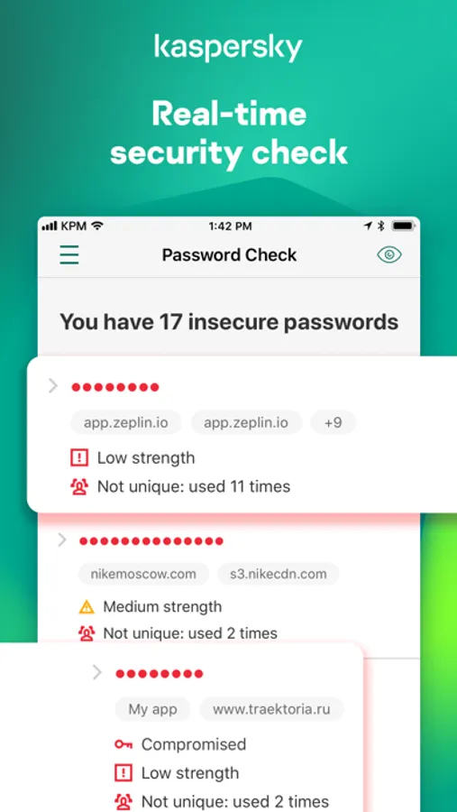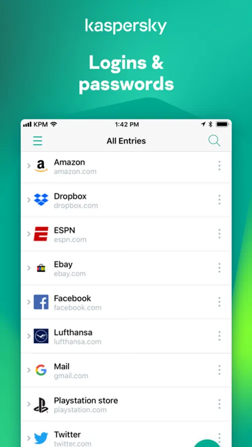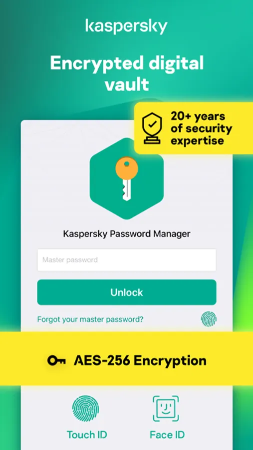 Unlock your vault with a master password not even Kaspersky knows. Plus access everything in double-quick time using Apple Face ID or Apple Touch ID*.