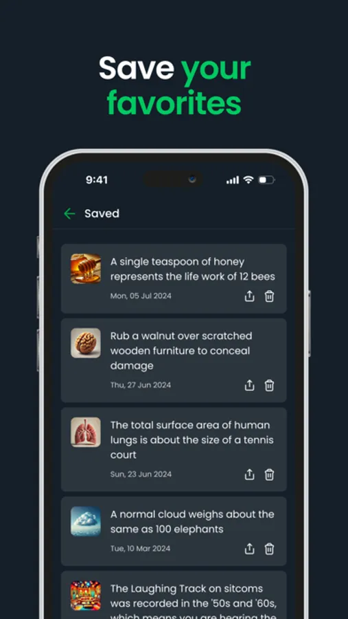 Build your own knowledge library by saving the facts that inspire you the most. With personalized catalogs, you can easily revisit your favorite topics whenever you like—turning Clevio into a go-to resource for continuous learning and inspiration.