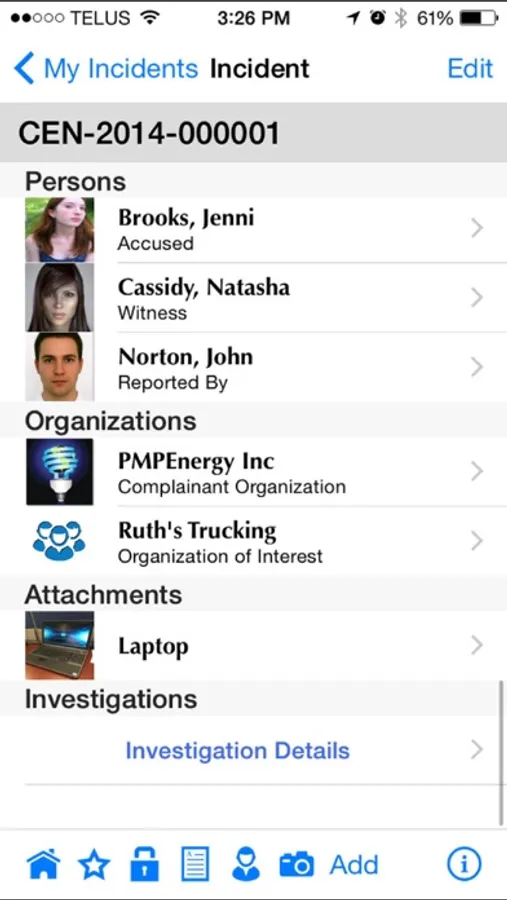 •Involvements (including persons, vehicles, items. and organizations).