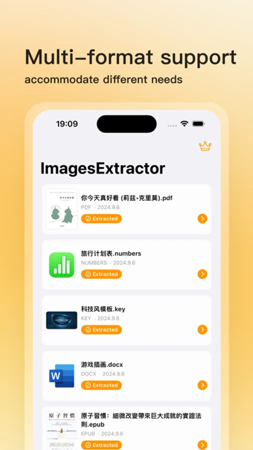 * Supports multiple file formats: Extract images from EPUB, PDF, PPT, Word, Excel, Pages, Keynote, Numbers files, and webpages.
