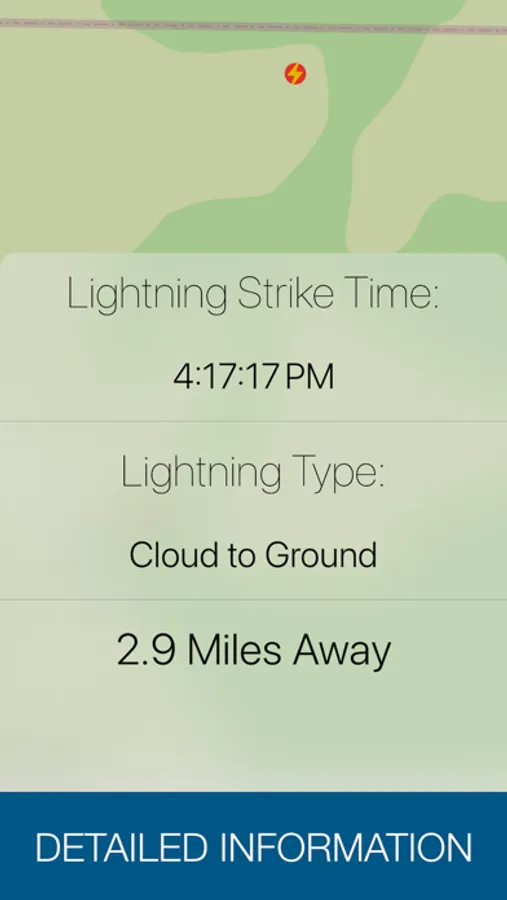 Lightning strikes are presented on a map view, where you can tap on each marked lightning strike for more details, including: