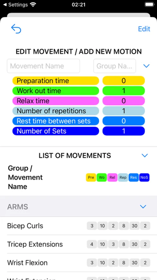 • Customized Exercise Groups: Create and organize different exercise movements into groups, allowing you to sort and manage them as needed.