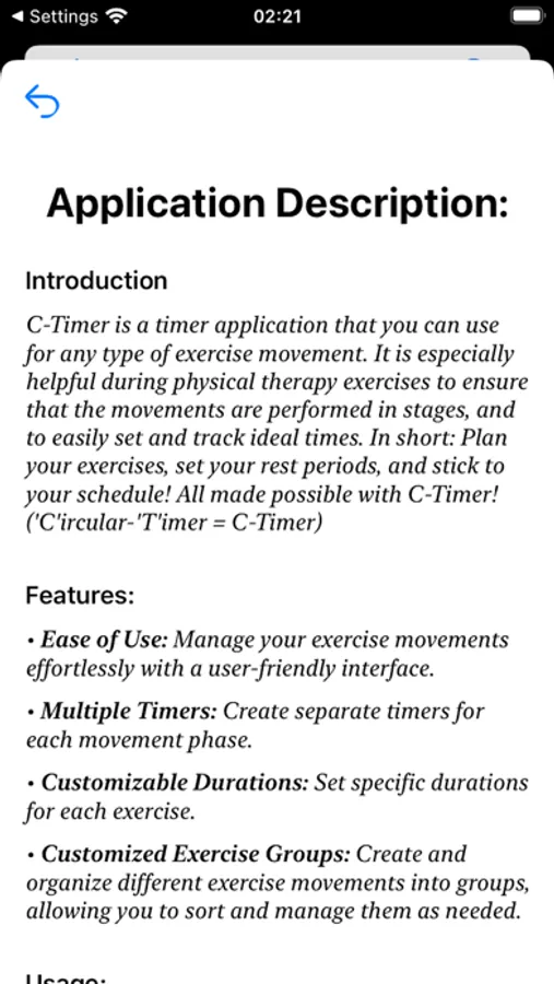 C-Timer is a timer application that you can use for any type of exercise movement. It is especially helpful during physical therapy exercises to ensure that the movements are performed in stages, and to easily set and track ideal times. In short: Plan your exercises, set your rest periods, and stick to your schedule! All made possible with C-Timer!