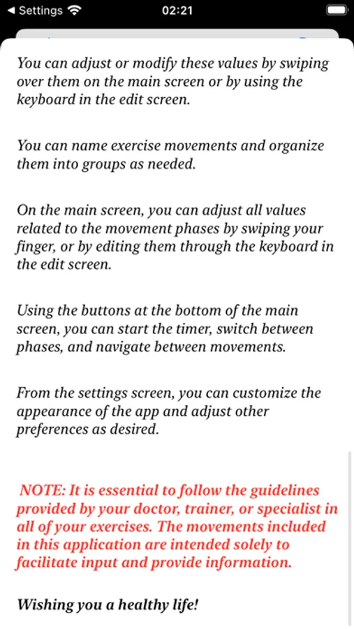 NOTE: It is essential to follow the guidelines provided by your doctor, trainer, or specialist in all of your exercises. The movements included in this application are intended solely to facilitate input and provide information.
