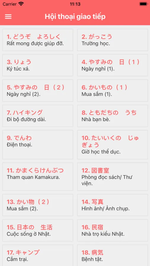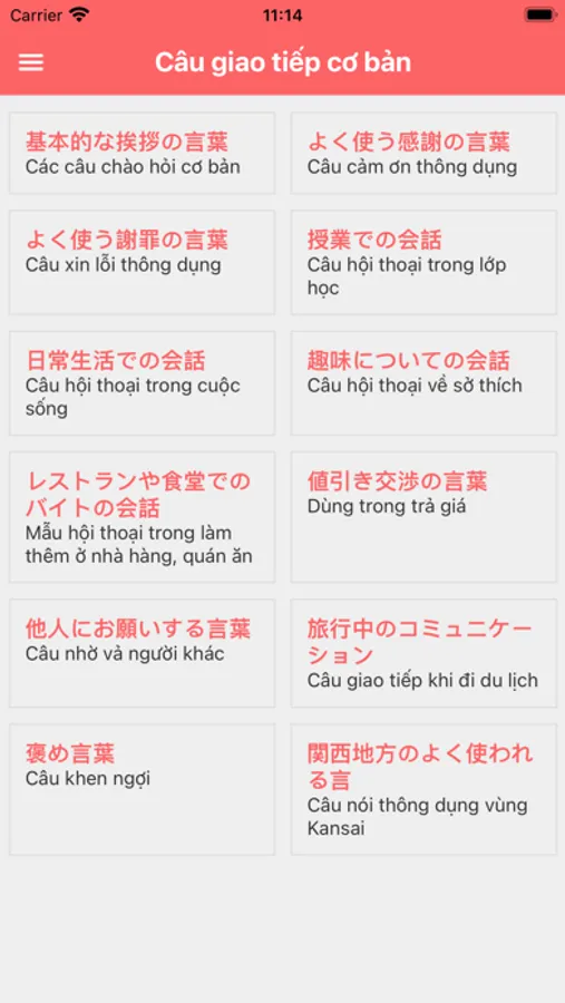 Với mỗi chủ đề Nhật mục bạn sẽ học được những câu nói thông dụng nhất.