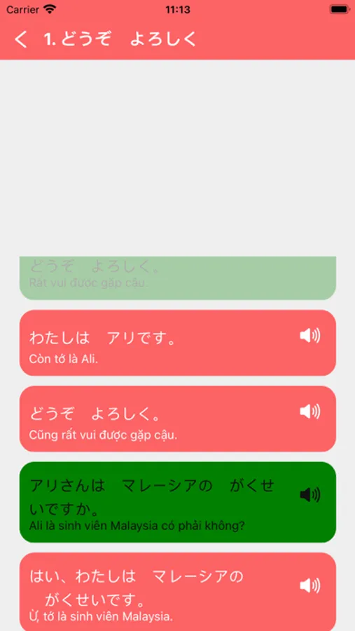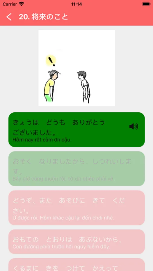 Cùng với đó ứng dụng bao gồm 20 chủ đề hội thoại giao tiếp trong tiếng Nhật. Kèm theo đó là hình ảnh hoạt hình mô tả cuộc hội thoại thêm phần sinh động cho quá trình học. Bạn có thể học và nắm được những câu nói trong đời sống hằng ngày của người Nhật