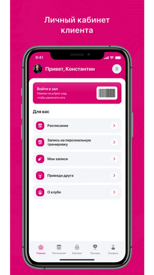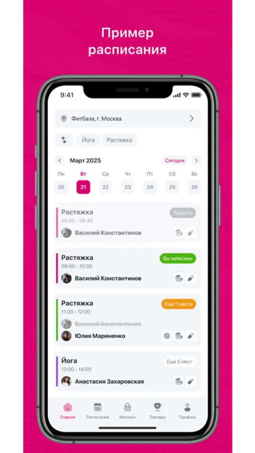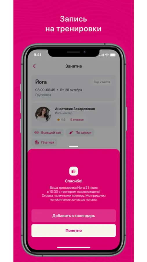- Получать PUSH-напоминания о предстоящей тренировке за 2 часа;