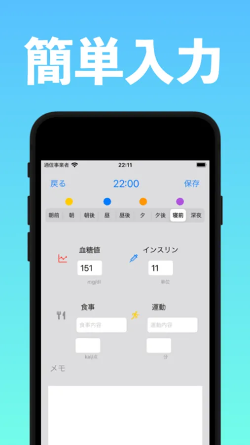 This app allows you to record your blood glucose levels, meals, exercise, and insulin doses as many times a day as you need.