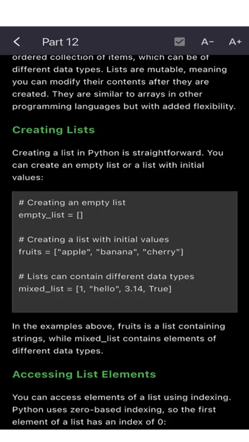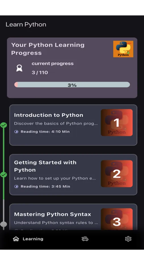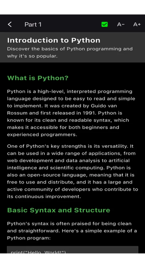 • Structured Learning: Our app offers a progressive learning path with well-organized content that covers everything you need to know about Python programming.