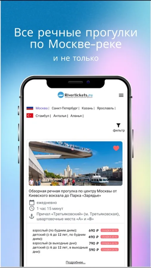 Приложение Rivertickets позволяет найти и купить билеты на теплоход просто и быстро! Большинство билетов на речные прогулки продаются в приложении со значительными скидками до 70% относительно стоимости билетов на причале или непосредственно на самом теплоходе при посадке.