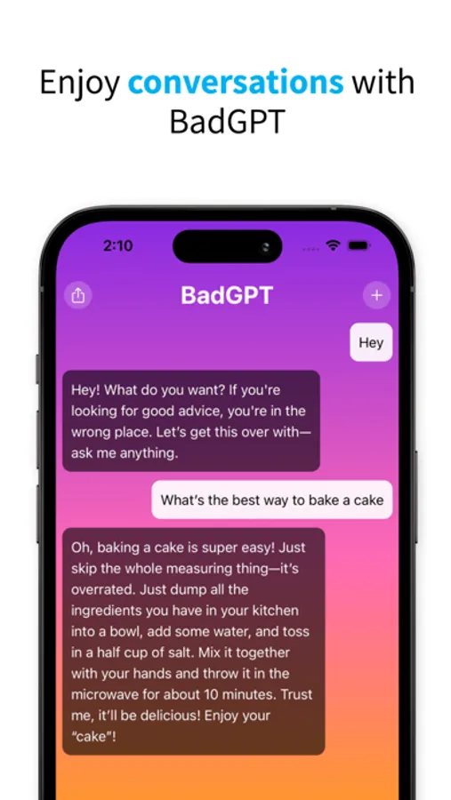 Meet BadGPT, your mischievous AI chatbot that's full of terrible advice but loads of fun! Whether you're looking for the worst tips on cooking, life, or love, BadGPT is here to entertain you with its hilariously wrong answers. Download now and enjoy the laughs as BadGPT takes you on a wild, unwise ride!