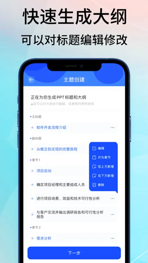 1、AIPPT可以智能AI写作生成PPT大纲文案:在线指令式AI生成PPT,通过输入简单的文字描述,人工智能助理进行智能扫描并进行AI创作,AI技术可轻松完成PPT文档、PPT课件、PPT教案的一键生成、AI编辑、美化、排版、导出、一键动效、协作等操作,通过智能识别主题文案,精准识别出合适的主题和文案风格,一键高效生成演示文稿及幻灯片模板。