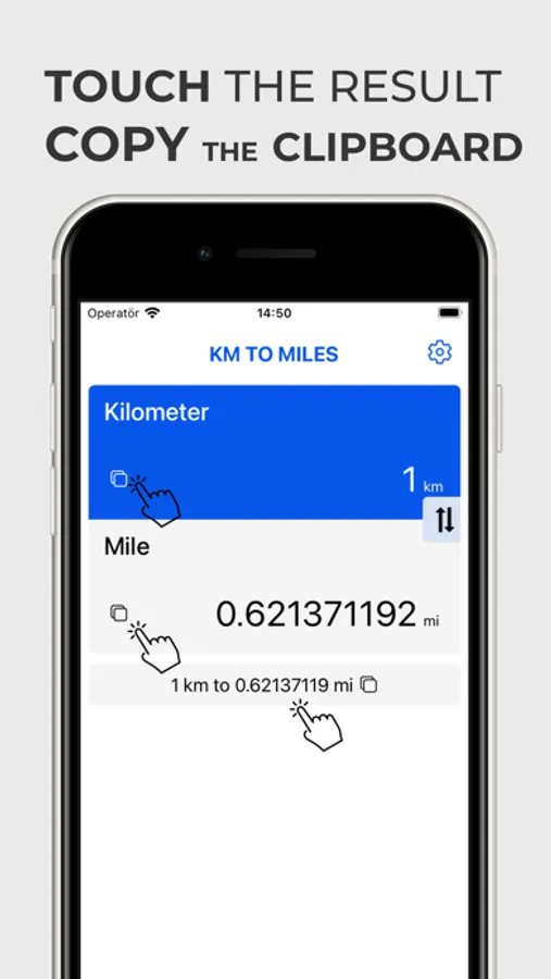 - Touch kilometers input box, enter number and convert to miles