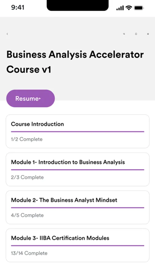 Inside the Business Analysis School app, you can:
