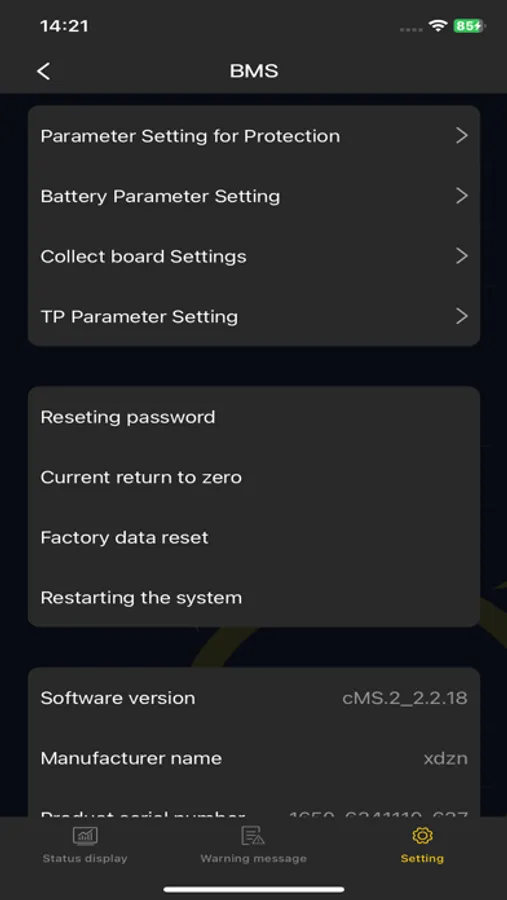 2. You can view the voltage, total voltage, SOC, real-time current, cycle times, temperature, voltage difference, equilibrium status, etc. of each string of the battery pack, and set protection parameters according to your own needs;