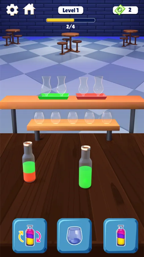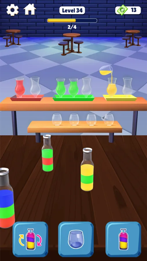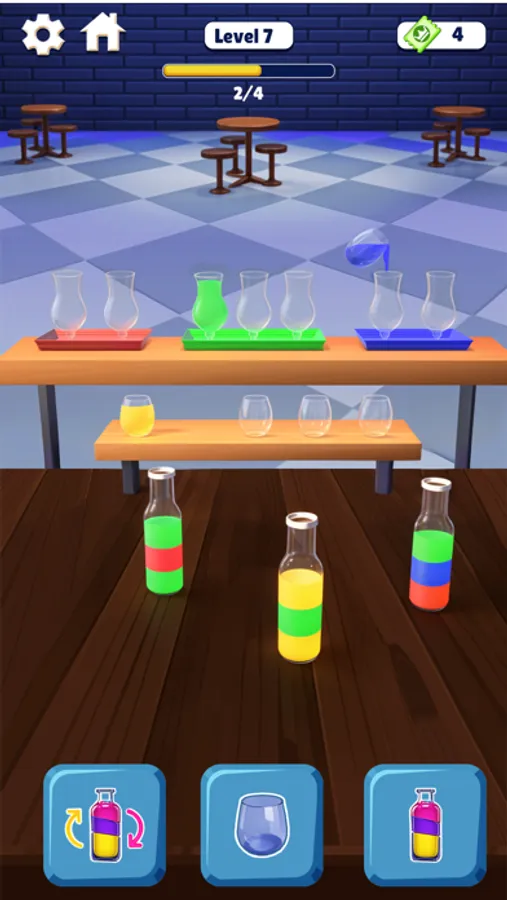 Your objective is simple yet challenging. Tap and move colorful liquids into their matching glass, each designated for a specific color. Strategically sort the colorful water to complete the puzzle. Fill each glass with a single color of water and use the small cups in the center for extra liquid.