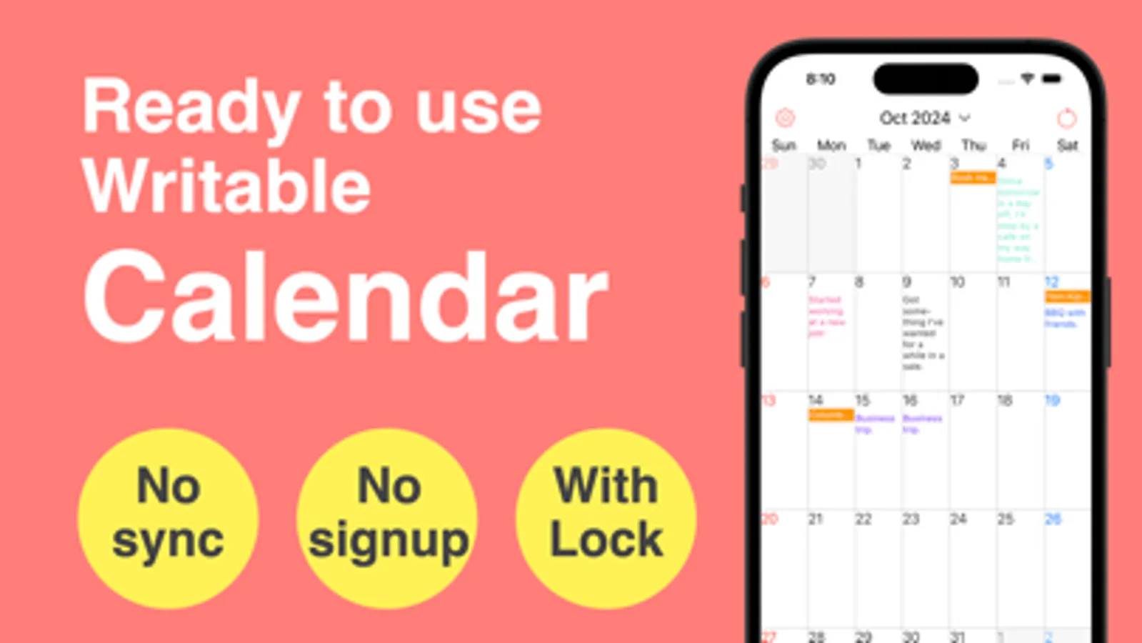 Easily record your daily plans and notes, and convert your calendar to a PDF for printing. This app does not sync with the iPhone’s built-in calendar, making it ideal as a secondary calendar. No account registration is required—just download and start using it immediately. With a simple interface and Touch ID/Face ID lock functionality, your privacy is protected.