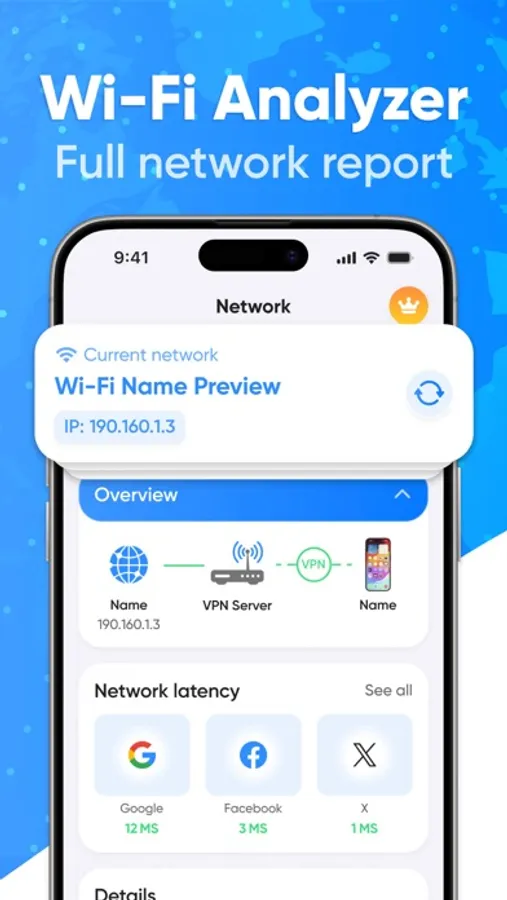 Wi-Fi Analyzer is your reliable assistant in managing your Wi-Fi network. Optimize your Internet connection, monitor security, and get the most out of your connection!
