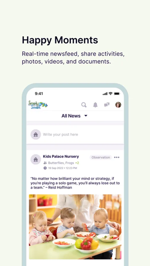 Bid farewell to the fear of missing out on your child's precious moments! Our app ensures you're constantly in the loop with instant updates, delightful photos, and heartwarming videos of your little one's activities and adventures throughout the day.