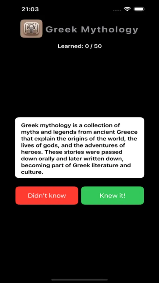 You’ll go through 50 flashcards, each with a question. If you know the answer, tap the green button. Once you’ve marked all 50 cards, you’ll have a solid understanding of the most important topics in Greek mythology.