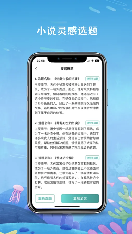 * 一键选题:挑选满意的选题,自动开始生成小说创作。