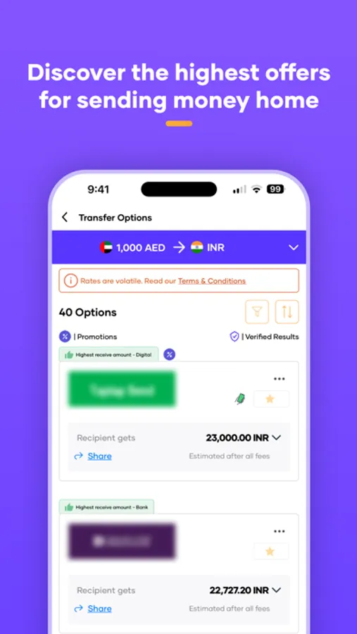 Send2 helps you easily compare rates, fees, and transfer speeds across leading money transfer providers — so you can get the best value for every dirham you send.