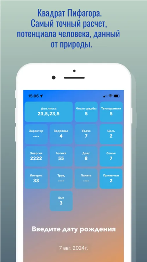 Приложение Психоматрица позволяет по дате рождения, используя Квадрат Пифагора, максимально точно понять заложенный в вас природный потенциал и особенности характера.
