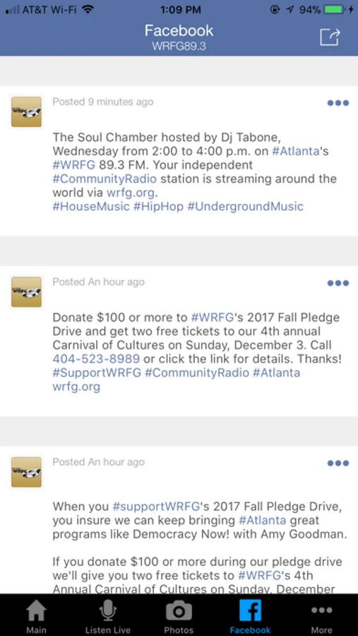 WRFG 89.3 Broadcasts 24 Hours a day at 100,000 Watts. WRFG provides a voice for those who have been traditionally denied access to the broadcast media and the involvement of a broad base of community elements to guarantee that access.