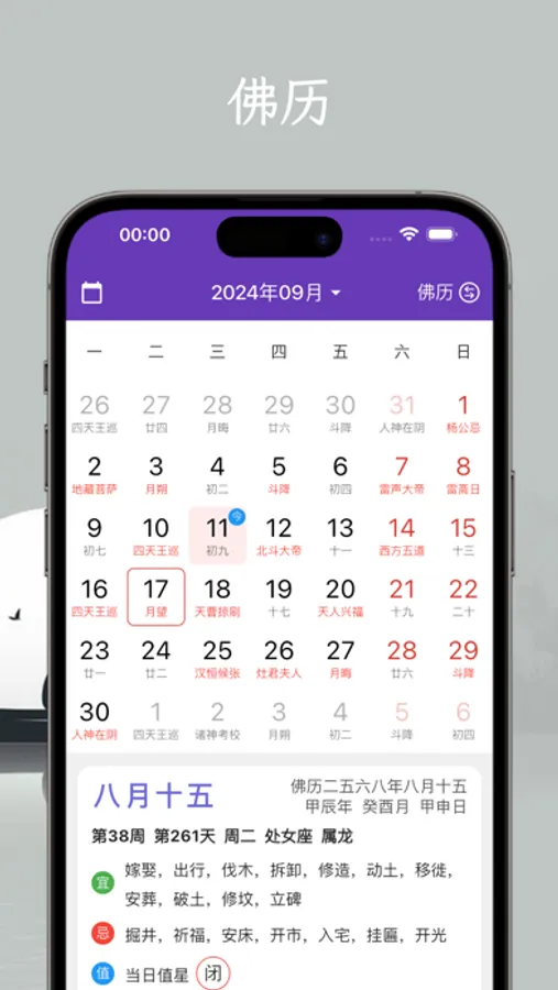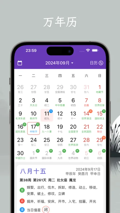 支持阳历、阴历、佛历、道历等多种日历,快速查询黄道吉日、节日假期。