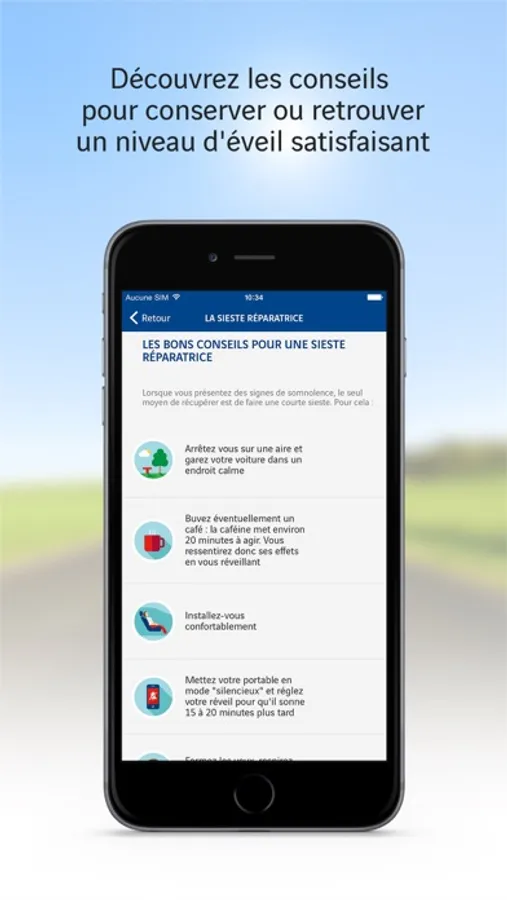 Une fois le test réalisé, et en fonction de son résultat, l’utilisateur accède à des fiches conseils élaborées en partenariat avec l’Institut national du sommeil et de la vigilance (INSV) sur les bonnes pratiques pour favoriser un repos efficace avant et pendant son trajet. L’application propose également des informations sur les dangers de la somnolence et de la fatigue au volant.