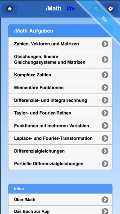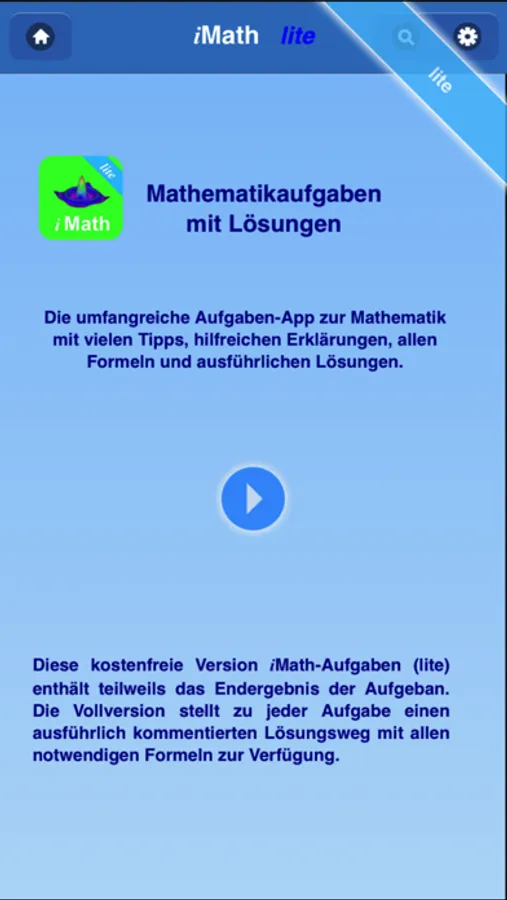 iMath-Aufgaben ist die umfangreichste Aufgaben-App zur Mathematik. In der kostenfreie lite-Version steht zu vielen der über 300 Aufgaben die Lösung zur Verfügung.