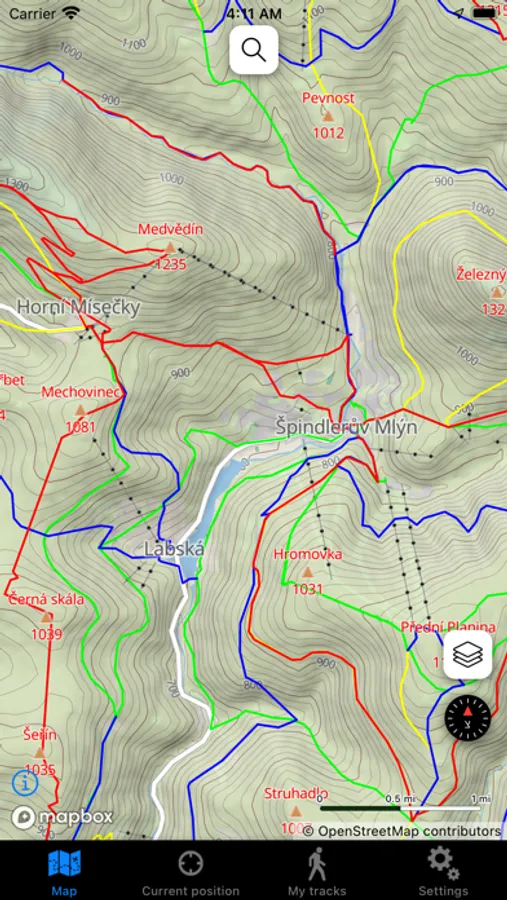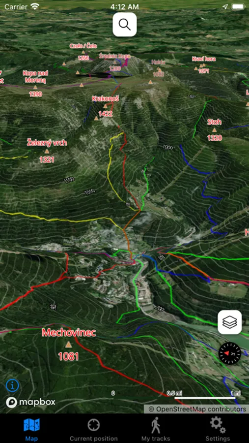 This application displays a detailed offline topographical map of Czech Republic with hiking trails, points, hills, etc. You can view it in 2D and 3D mode, now also with a satellite base map. You can record your tracks and the application will then render them on the map, calculate various statistics and height profiles. Recorded tracjs are saved in GPX format and you can easily transfer them to your computer.