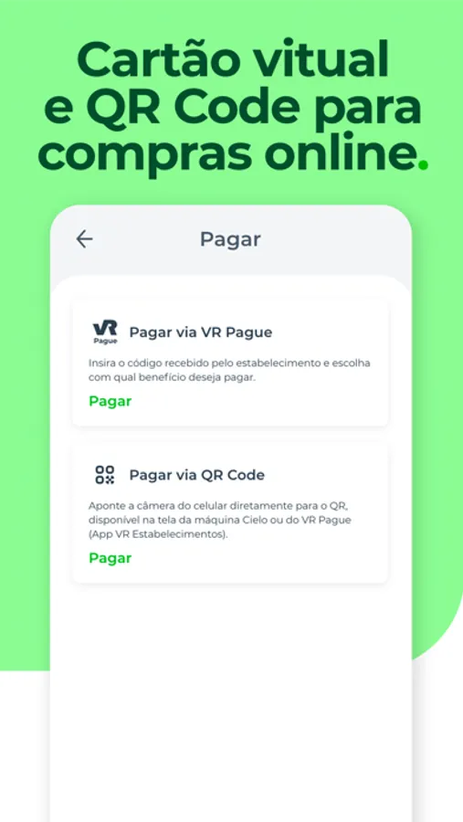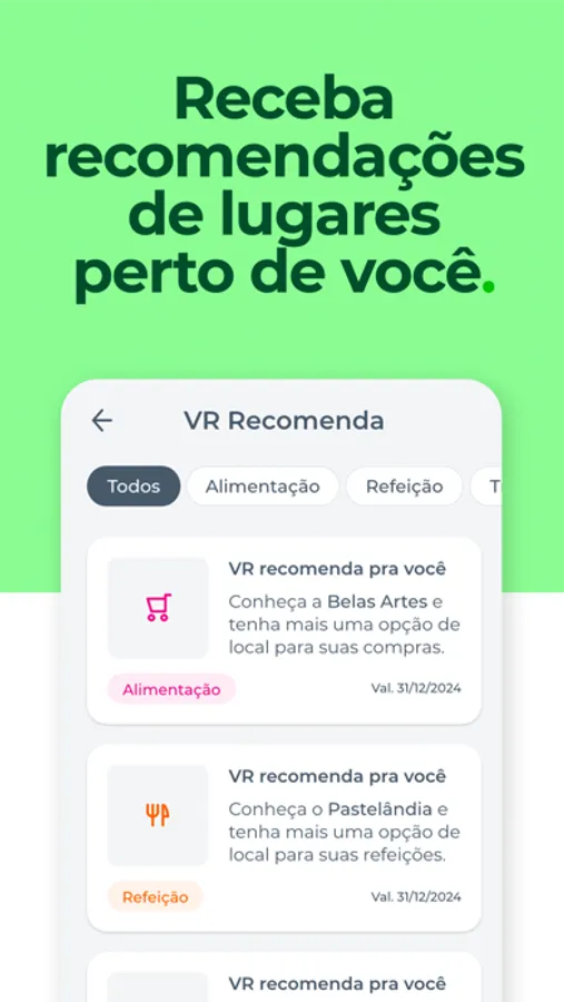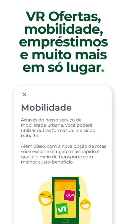 Um aplicativo que você encontra tudo sobre o seu benefício, conta com outros serviços, promoções e facilidades na palma da sua mão. Consulte saldo, extrato e a nossa rede credenciada. Receba confirmação de compra por push com valor gasto e o local em cada uso que fizer. Receba promoções exclusivas e recomendações de lugares perto de você que aceitam o seu cartão VR Benefícios.