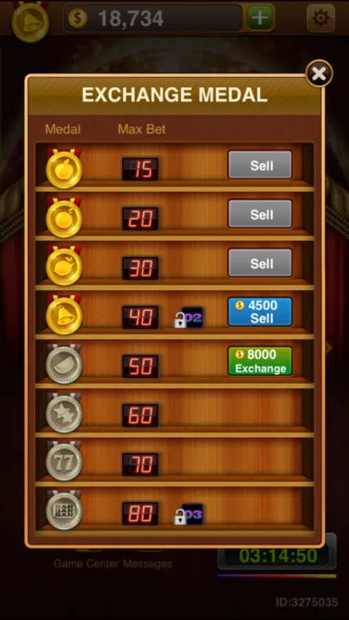 3. Medals and top limit of bet: upgrade medals to improve the bet top limit.Machine 2 will be unlocked after upgrading to Bell Medal, and Machine 3 will be unlocked after upgrading to BAR Medal.