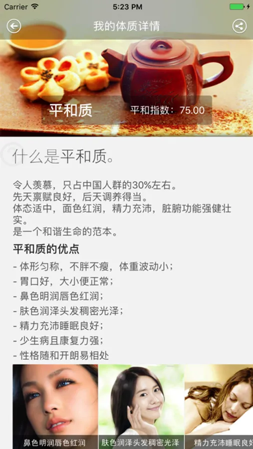 该标准将体质分为平和质、气虚质、阳虚质、阴虚质、痰湿质、湿热质、血瘀质、气郁质、特禀质九个类型。在合理的饮食指引和生活建议下,可以在30-90天的时间内明显改善你的身体不良状态,获得更健康的身体状况
