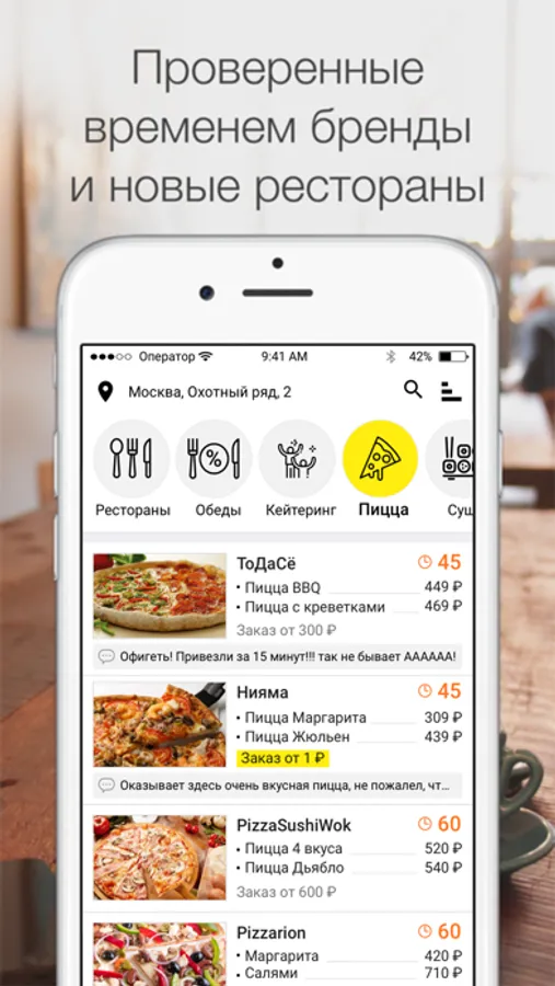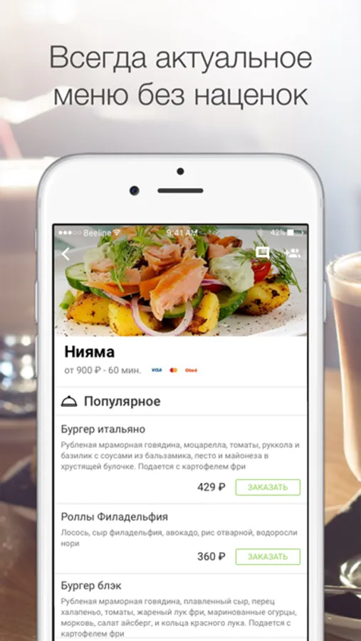 Заказ еды сделать очень просто: приложение определит ваше местоположение и покажет вам ближайшие рестораны с доставкой еды.