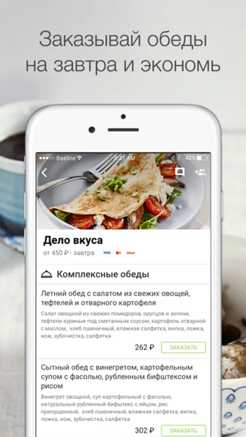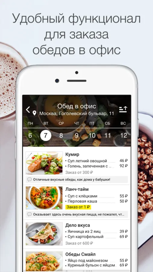 А самое главное отличие от конкурентов – через наше приложение можно заказать еще и самые дешевые обеды в офис! Вы делаете заказ на завтра, поэтому еда обходится вам гораздо дешевле. Где еще вы найдете комплексный обед по цене от 50 рублей?