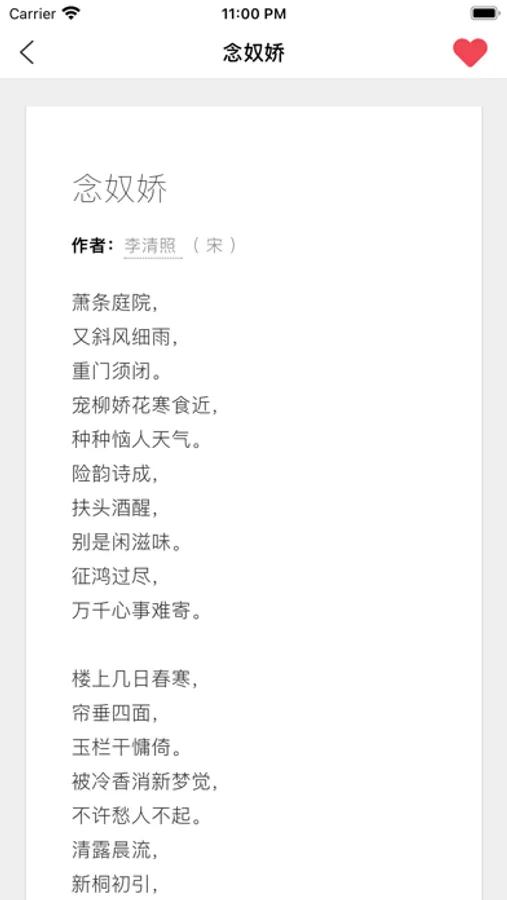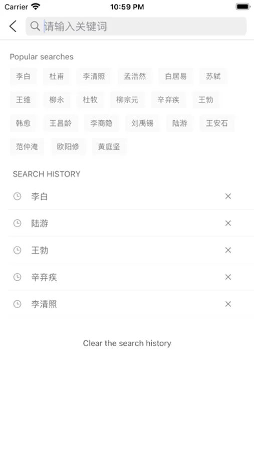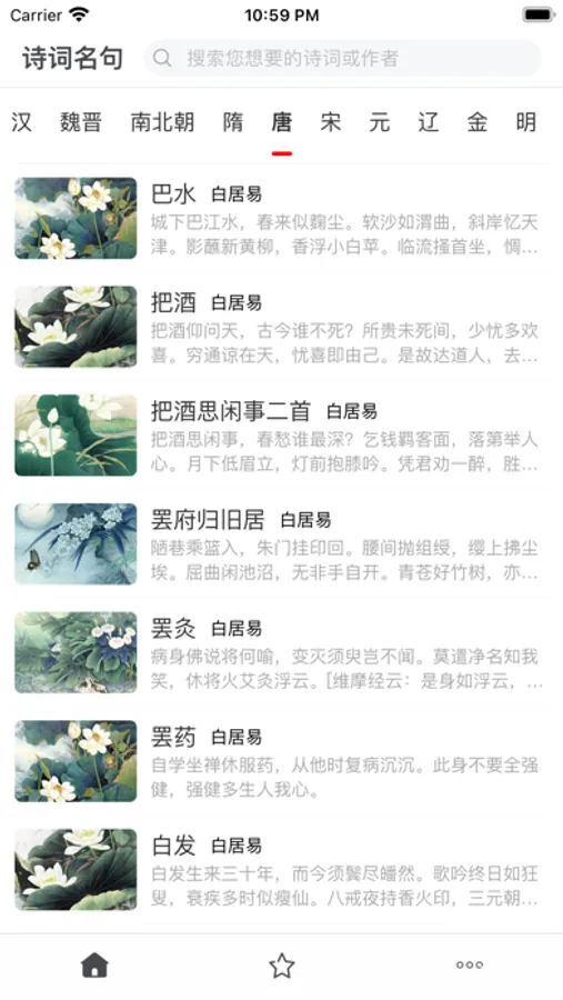 本App收录先秦、汉朝、魏晋、南北朝、隋朝、唐朝、宋朝、金朝、辽朝、元朝、明朝、清朝、近当代60000多首。学习及弘扬诗词文化,必选此App。