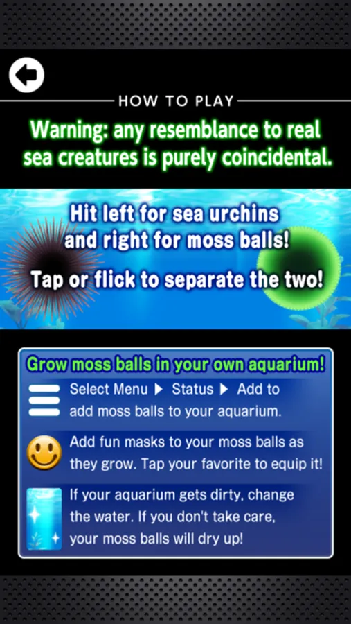 -Tap or flick to sort the incoming sea urchin and moss balls!