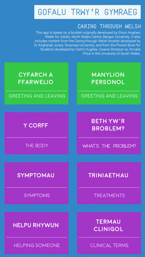 The app was updated in 2018 for Swansea University and the Coleg Cymraeg Cenedlaethol with additional sections of terminology specifically for nurses, midwives, social workers, doctors, health visitors, care workers, paramedics, phlebotomists and physiotherapists. Its aim is to help individuals to use Welsh with their patients.