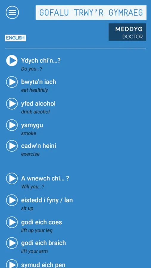 Diweddarwyd ar yr ap hwn yn 2018 ar gyfer Prifysgol Abertawe a’r Coleg Cymraeg Cenedlaethol gydag adrannau ychwanegol o dermau ac ymadroddion yn benodol ar gyfer nyrsys, bydwreigiaid, gweithwyr cymdeithasol, meddygon, ymwelwyr iechyd, gweithwyr gofal, parafeddygon, gwaedyddion a ffisiotherapyddion. Ei bwriad yw helpu unigolion i ddefnyddio’r Gymraeg gyda’u cleifion.