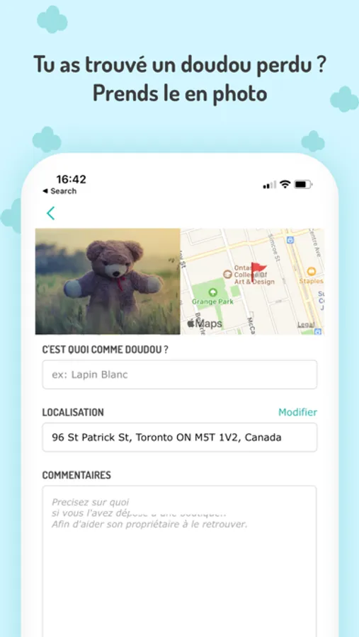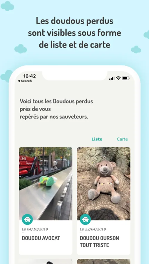 Affichage des doudous perdus géolocalisés en mode "LISTE" ou "CARTE" avec accès à leur fiche détaillée.