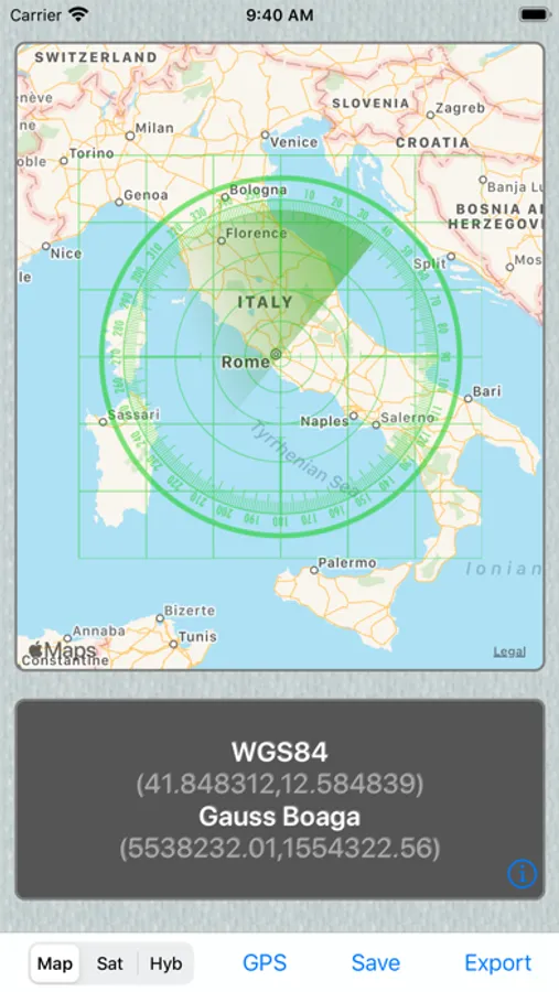 Select your target coordinate system and locate point in the map, below you can read coordinates in wgs84 ( map default ) and target coordinate system too ; to locate and translate current position, use GPS button