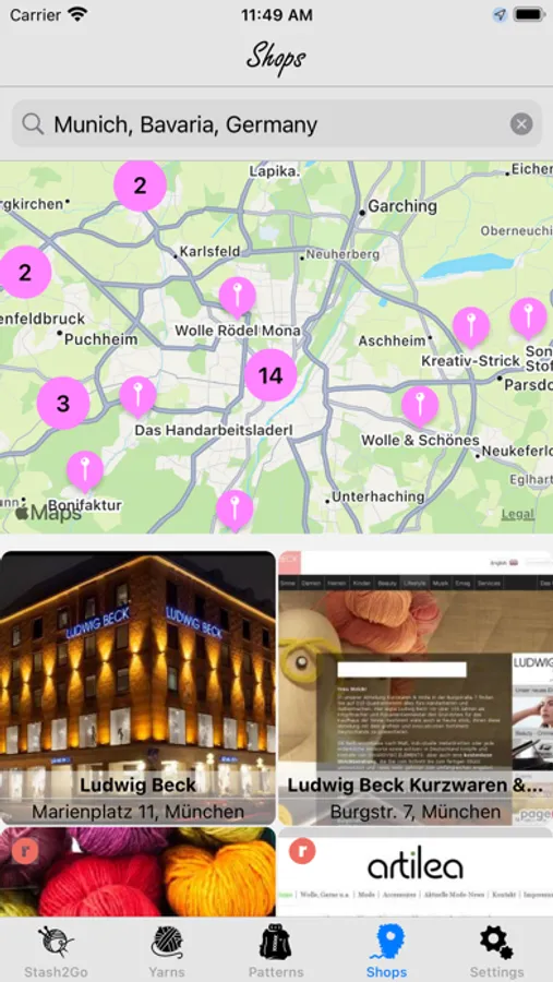 * Search for yarn shops based on your current location, review the routing directions, opening schedule, sold yarns and other details