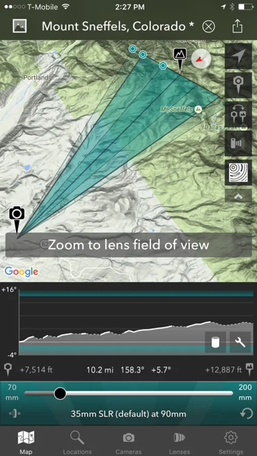 Photo Transit includes detailed elevation profile information so you can scout your sightlines ahead of time, and check whether your planned focal length will capture your subject. Photo Transit's vertical field of view chart lets you see if your subject will be visible or obstructed by the local terrain.