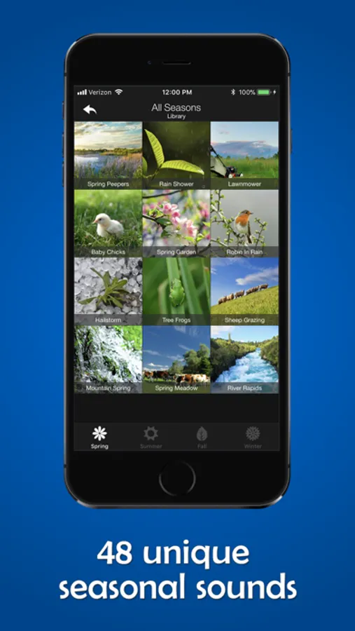 Spring Peepers, Rain Shower, Lawnmower, Baby Chicks, Spring Garden, Robin, Hailstorm, Tree Frogs, Sheep Grazing, Water Spring, Spring Meadow, River Rapids, Ocean Surf, Lakeside, Garden Fountain, Cicadas, Barbecue, Grass Field, Summer Garden, Irrigation Sprinkler, Motor Boat, Rowing, Summer Night, Summer Storm, Rainy Day, Walking On Leaves, Rain On Tent, Leaf Raking, Storm Drain, Traffic In Street, Wind On Leaves, Driving In Rain, Leaf Blower, School Bus, Candle, Wind Chimes, Walking In Snow, Open Fire, Cardinal, Icy Waves, Electric Heater, Ice Skating, Icicles Dripping, Sled, Snow Blower, Icy Waterfall, Blizzard and Ice Cracking.