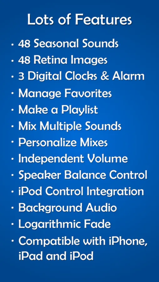 White Noise Seasons allows you to experience any season at any time. We designed the app to help you sleep soundly in environments that can be problematic for restful sleep. Just read our reviews and to see how many people are sleeping better since they started using White Noise Seasons. Includes high-quality looped sounds such as Spring Peepers, Ocean Surf, Walking On Leaves and Electric Heater.