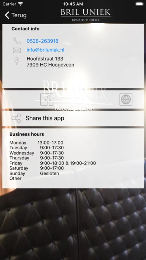 Met de App van BrilUniek bent u altijd op de hoogte van het laatste nieuws vanuit de winkel. Tevens heeft u alle informatie over de winkel, zoals openingstijden, adres gegevens, telefoonnummer en de huidige collecties.nnAls lens gebruiker heeft u de mogelijkheid om de lenstimer te gebruiken. Hiermee vergeet u nooit meer uw lenzen te vervangen of nieuwe te bestellen.nWilt u nieuwe lenzen bestellen of een afspraak maken? Dat kunt u direct vanuit de App regelen.nnTot ziens in onze winkel.